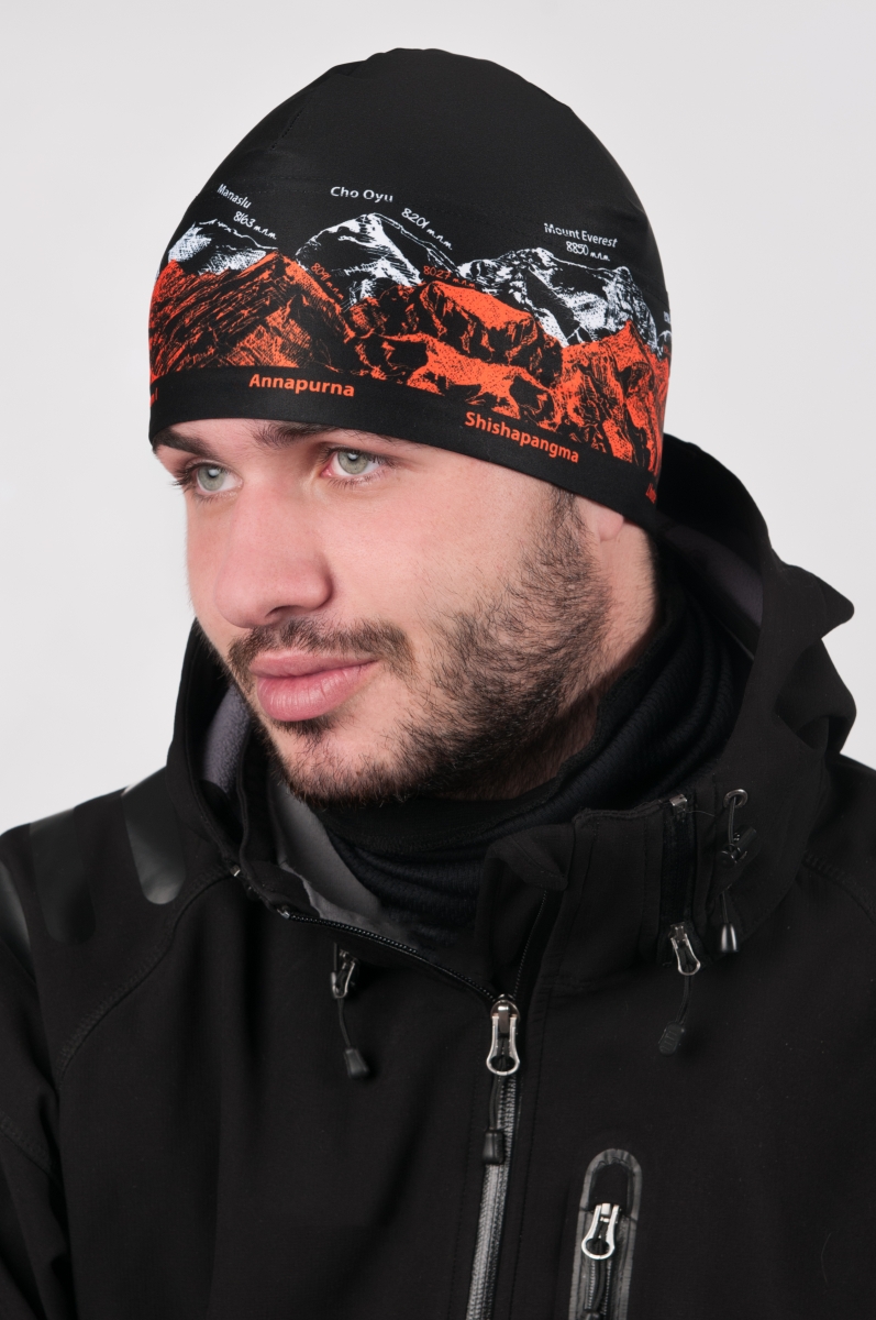 Pánská černá sportovní outdoorová čepice s jedinečným designem čtrnácti světových osmitisícových hor oranžovo-bílé barvě, splňuje všechny parametry funkčního doplňku. Čepoce je vhodná k celoročnímu nošení. V létě v chladnějších dnech.EAN: 8595654116051