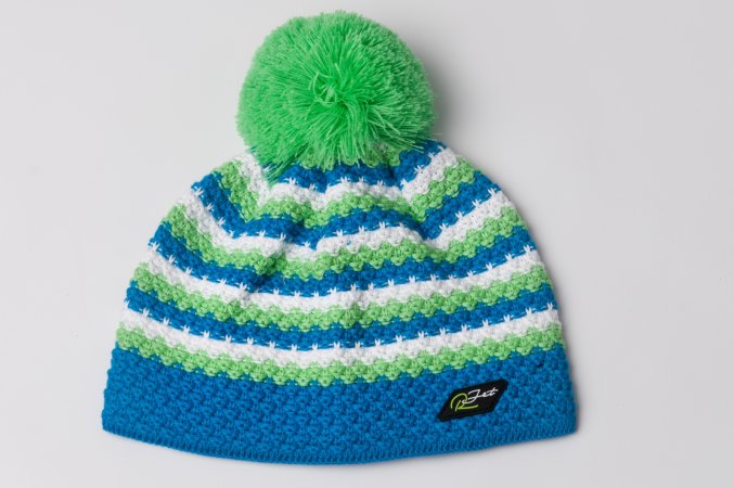 Modro-zelená dětská zimní čepička pro kluky barevnými proužky a bambulí