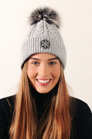 Světle šedá dámská zimní pletená čepice s pravou kožešinovou odepínací bambulí je ozdobena vyšívanou stříbrnou vločkouKód 1: TF/BA 23