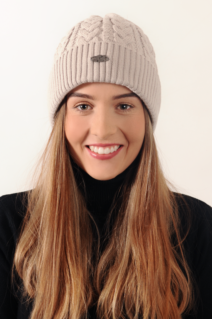 Béžová dámská zimní pletená čepice bez bambule je ozdobena kovovým logemKód 1: SF/BB 40