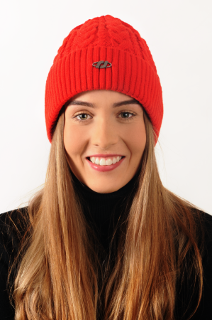 Červená zimní pletená čepice bez bambule je ozdobena kovovým logemKód 1: SF/BB 37